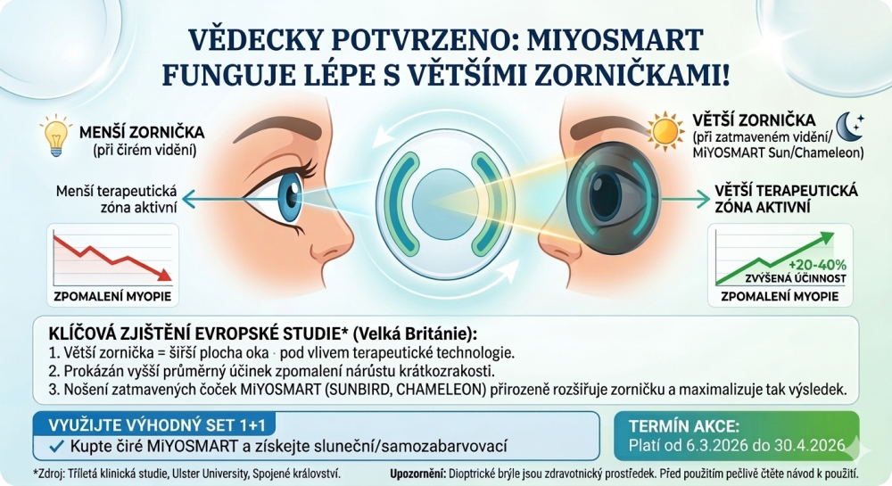 Klinické studie* naznačují, že terapeutický efekt čoček MiYOSMART může být vyšší při širší zorničce, která se přirozeně tvoří při používání zatmavených skel venku. Nošením sluneční varianty SUNBIRD nebo CHAMELEON tak nejen chráníte oči před UV zářením, ale zároveň podporujete efektivitu metody i během venkovních aktivit.